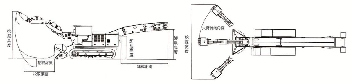 本機靠推進鏟取巖石并通過鏟斗將石料扒進自身的刮板輸送機,輸送機從尾部將巖石卸入側卸式礦車、箕斗、皮帶機、梭式礦車、自卸汽車等其它轉載設備上去。同時可利用反鏟挖掘臂扒取遠處的巖石,也可以用鏟斗來清理工作面和斷面排險、掏水溝。